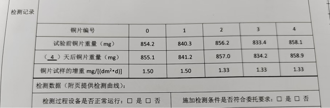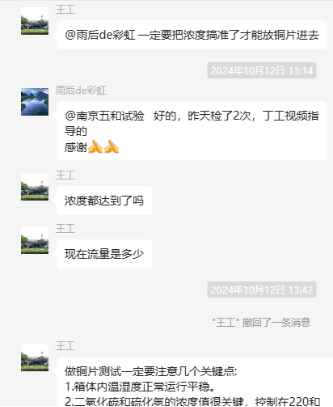 為了更好地說明銅片試驗的重要性,下面分享一個檢測公司的銅片試驗實際案例:2024年8月份合肥******檢測技術(shù)有限公司第一次采購我司一臺型號為“WHQ-300B”型的混合氣體腐蝕試驗箱,設(shè)備被運送到客戶指定的場地安裝調(diào)試運行。安裝調(diào)試后,客戶后期自行進(jìn)行一次銅片增重試驗,我司技術(shù)人員進(jìn)行線上指導(dǎo)操作,試驗結(jié)束之后客戶將數(shù)據(jù)發(fā)給我司,以下是客戶和我司聊天記錄以及客戶做的數(shù)據(jù)信息: